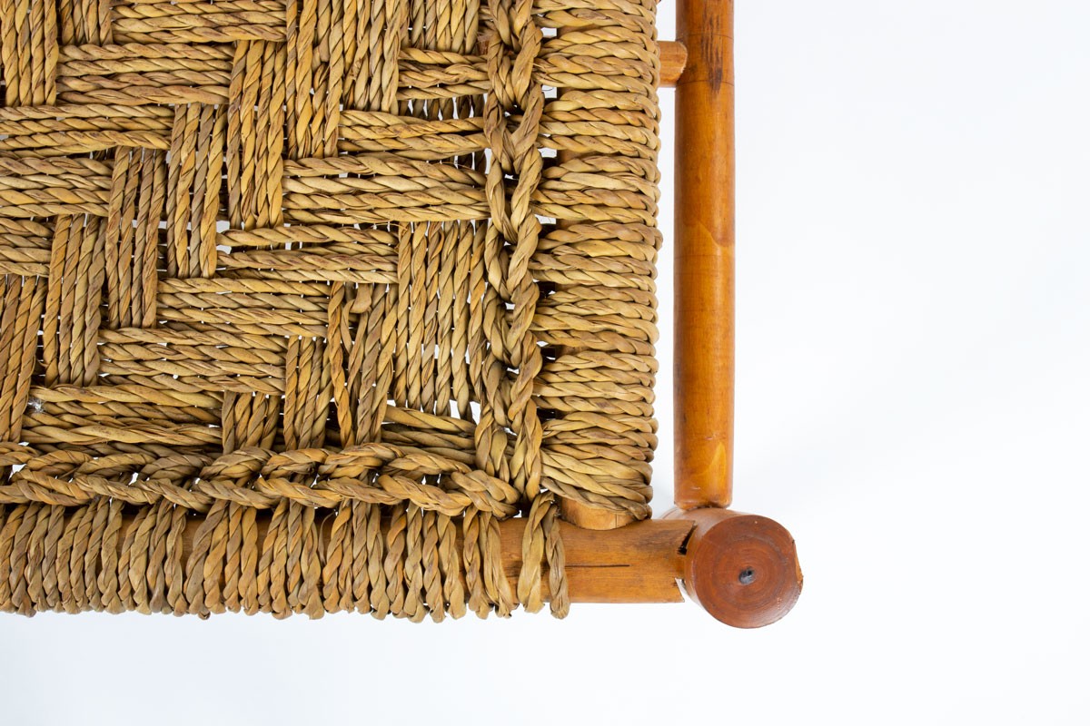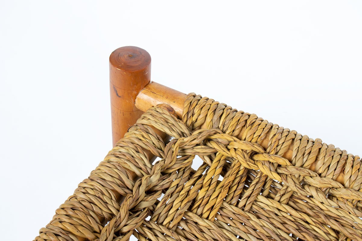 The table features a wooden frame with a natural patina, highlighting the grain and nuances of the wood. The tabletop is made of carefully woven straw, demonstrating artisanal skill and technical mastery. The apparent simplicity of the piece underscores the quality of the construction and the finesse of the weaving.