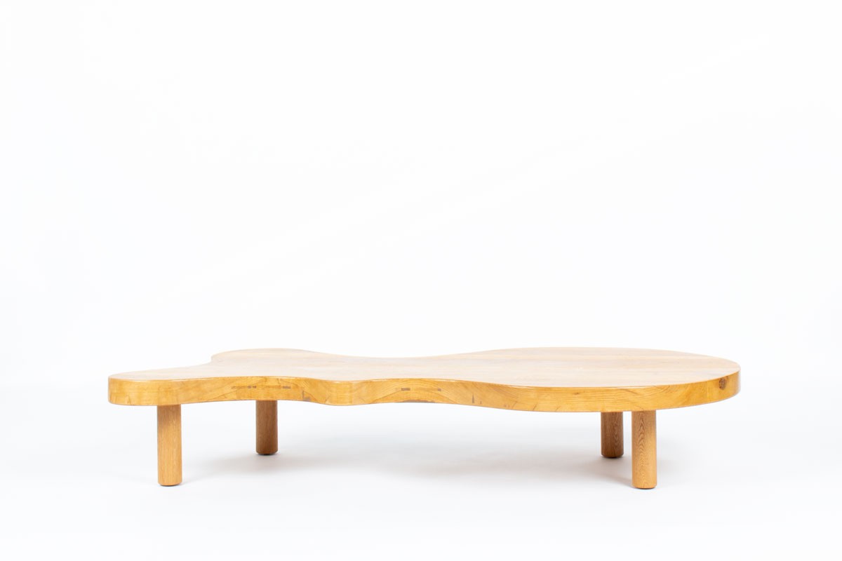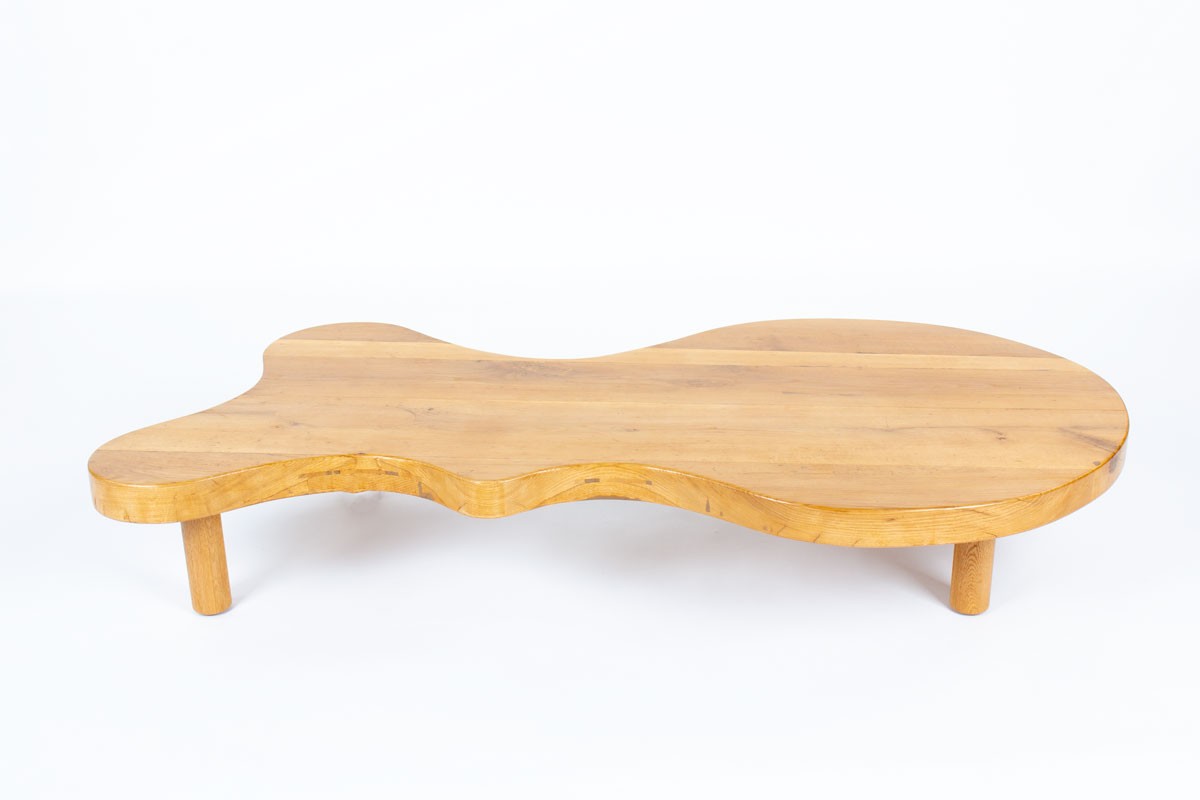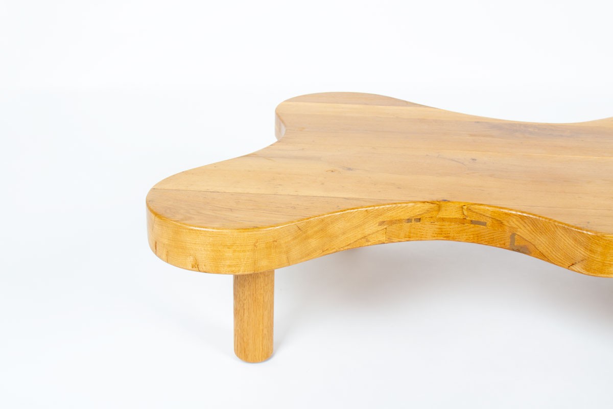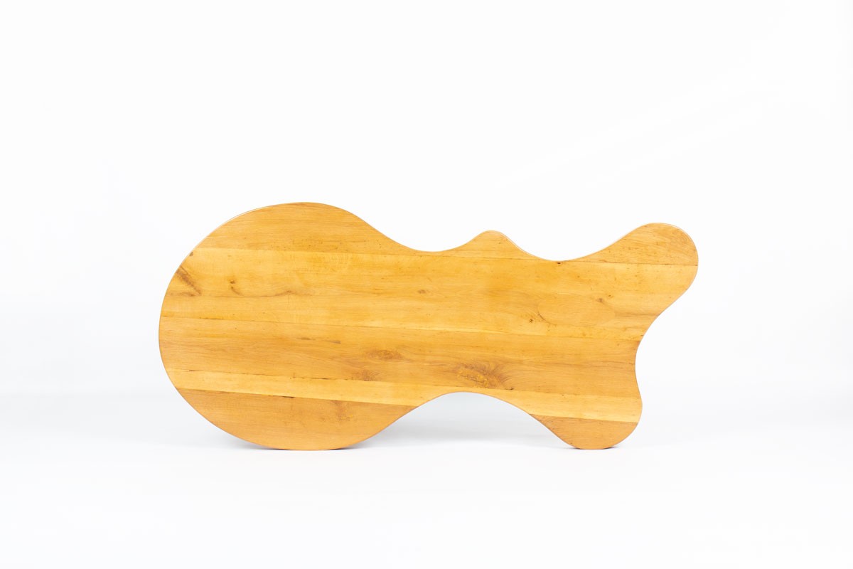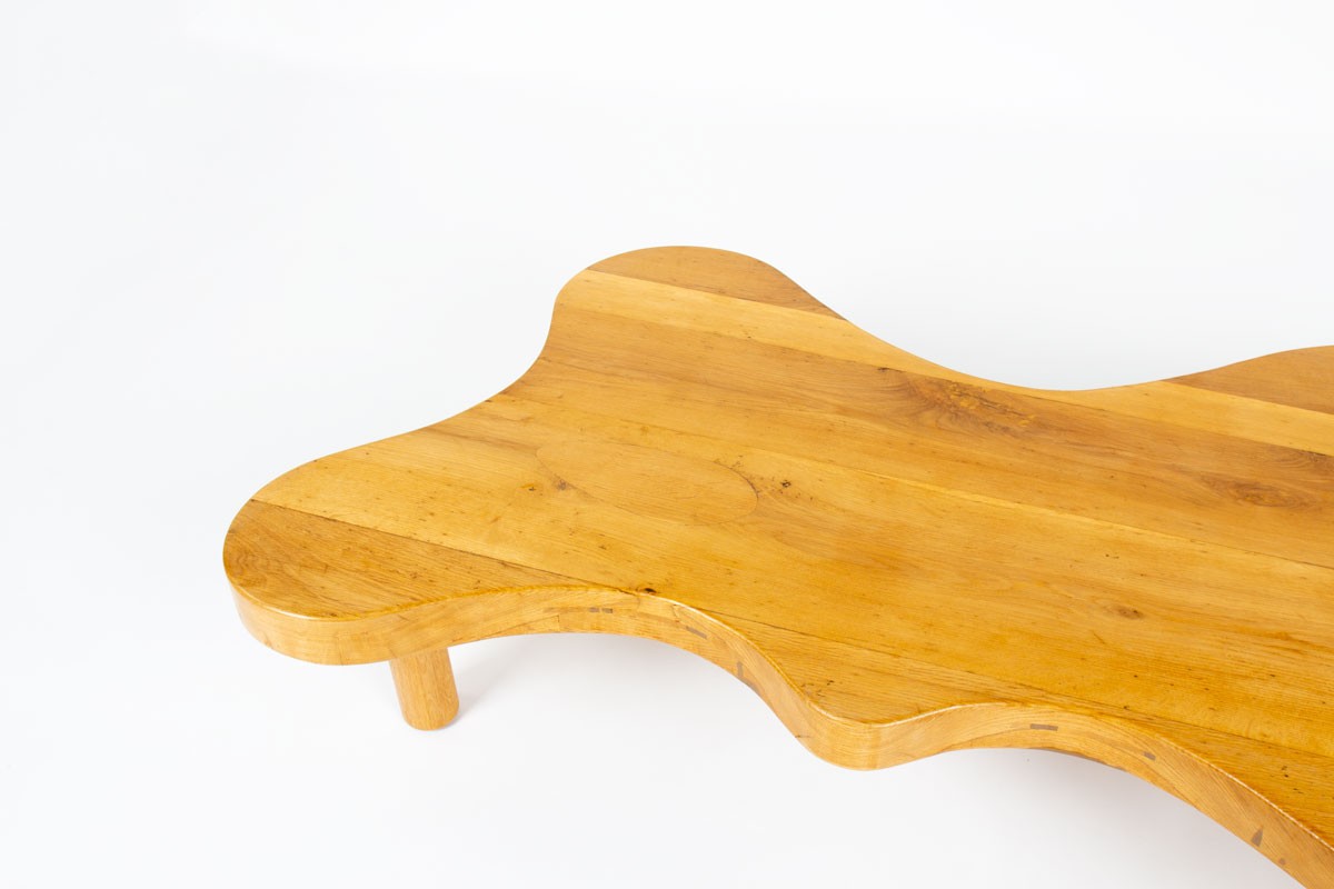 The table stands on four cylindrical “log-style” legs and features a thick tabletop with organic lines. Its construction details and assembly system are reminiscent of iconic French designers such as Charlotte Perriand and Pierre Chapo, whose work emphasized honest materials, structural clarity, and functional elegance.