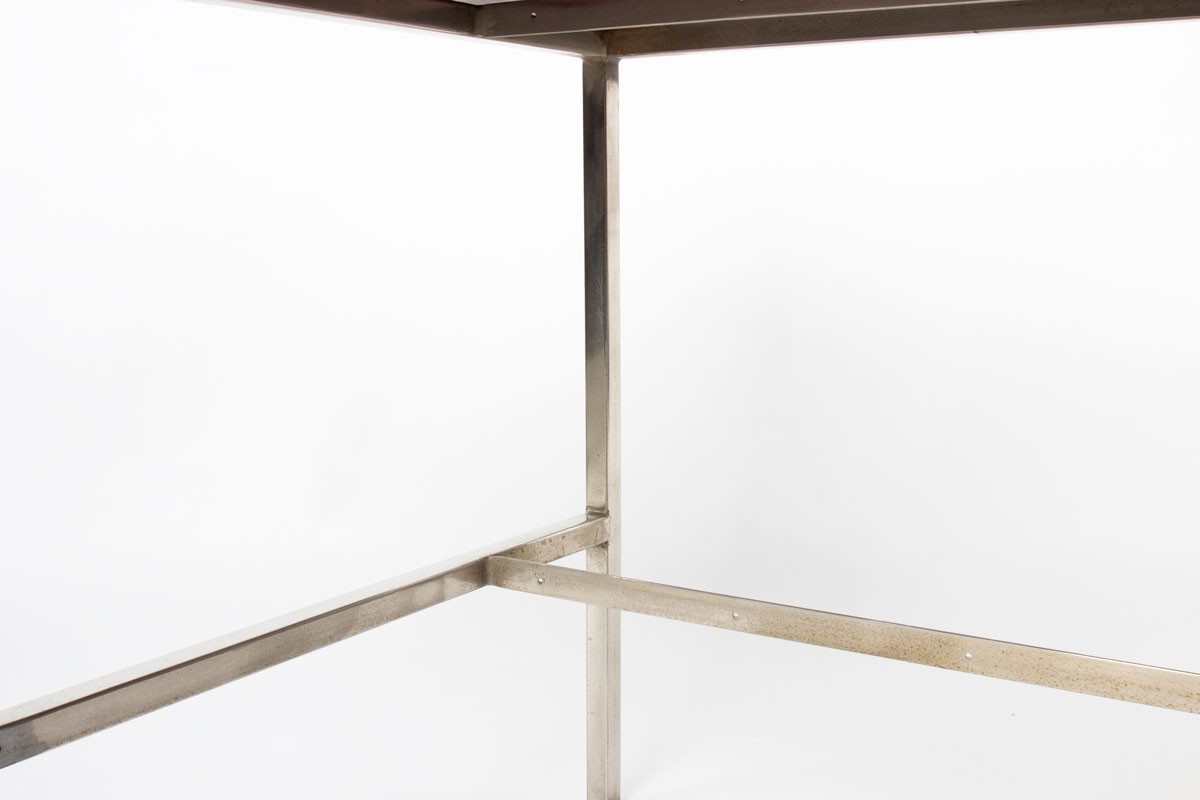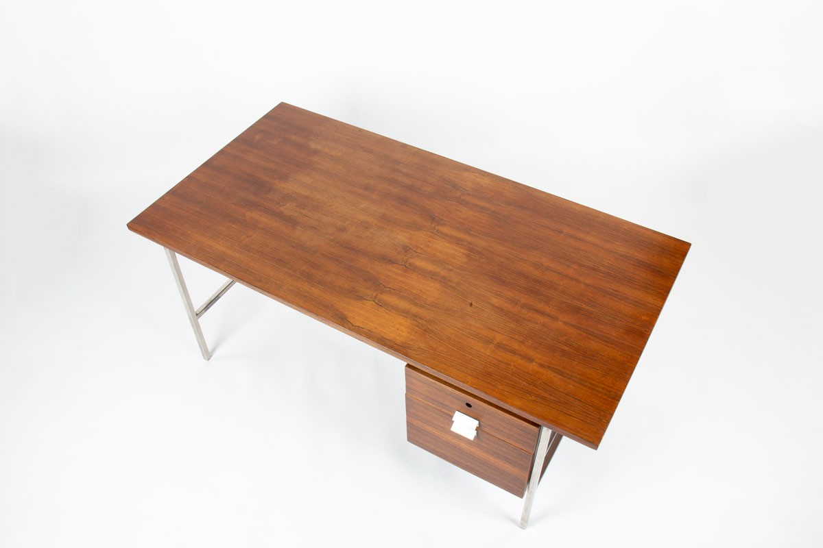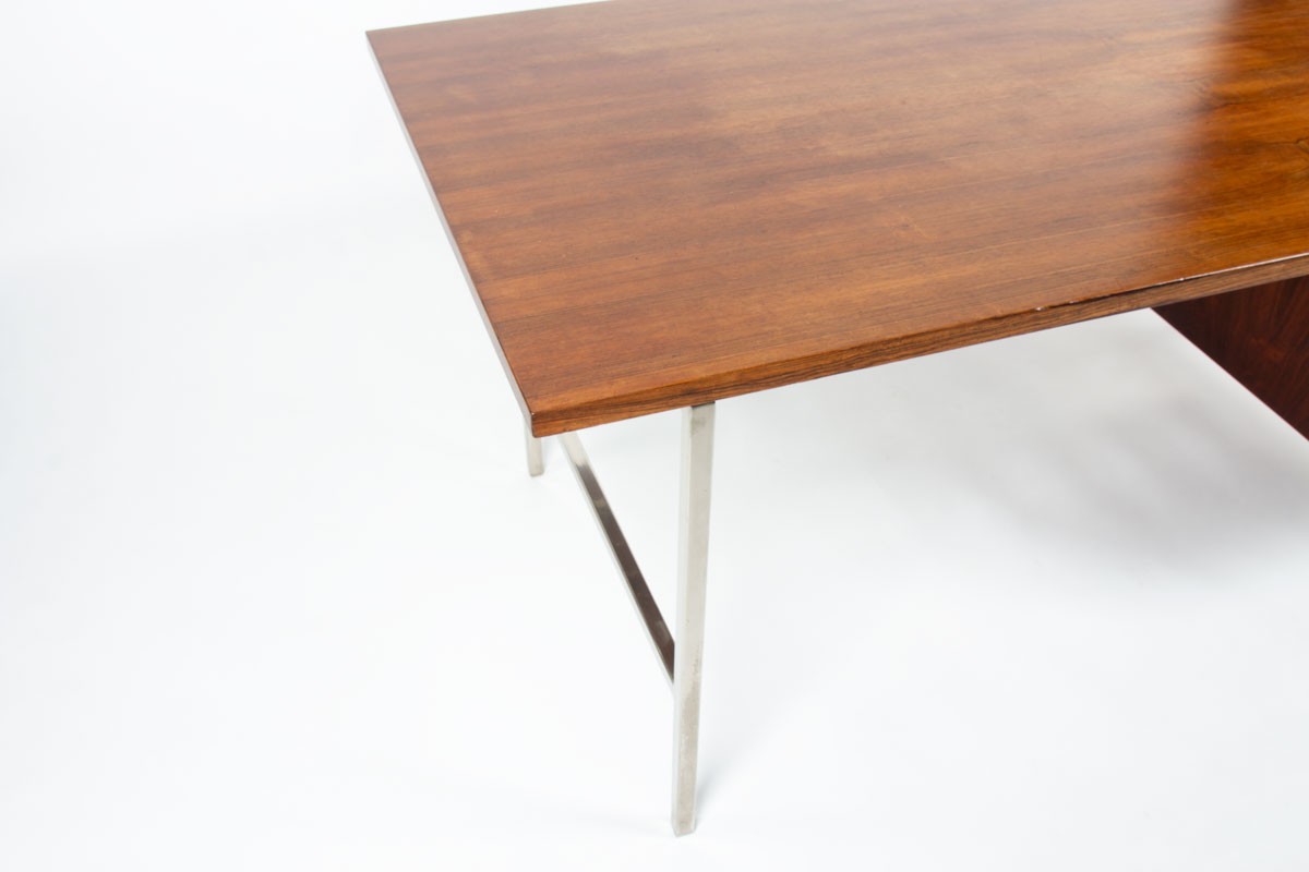 The polished metal base provides a subtle contrast to the warmth of the wood, while ensuring both stability and lightness to the structure. The balance between clean lines and refined materials perfectly illustrates the work of Alain Richard, renowned for his functional approach and modernist aesthetic.