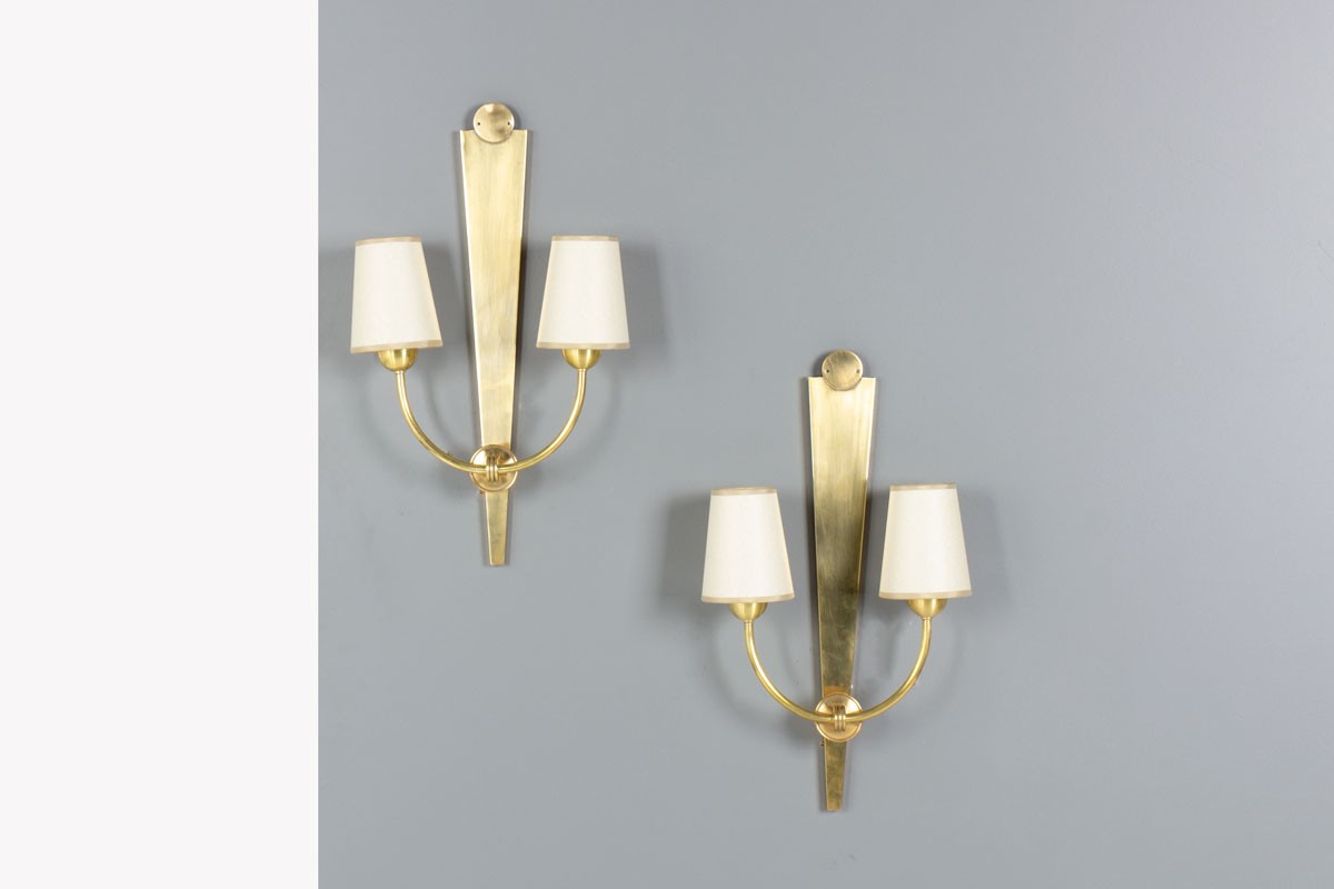 These sconces capture the charm of mid-century design combined with custom craftsmanship. Their patinated brass finish gives them a unique and authentic character, ideal for enhancing a living room, bedroom, or hallway with style.