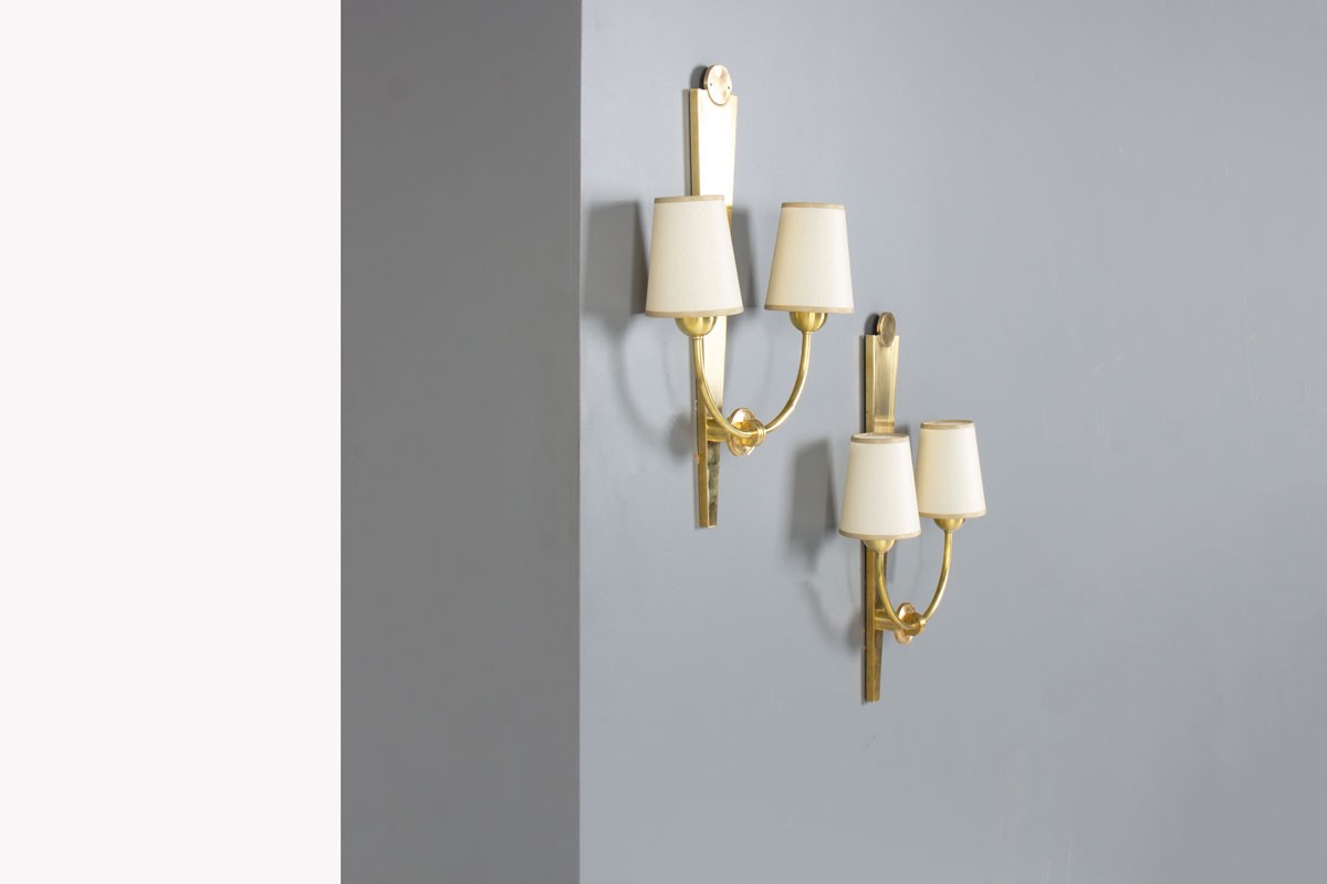 Add a touch of timeless elegance to your interior with this pair of vintage 1950s brass wall sconces. Each sconce features two light points, subtly complemented by custom-made paper lampshades that diffuse a soft, warm glow—perfect for creating a cozy and refined atmosphere.