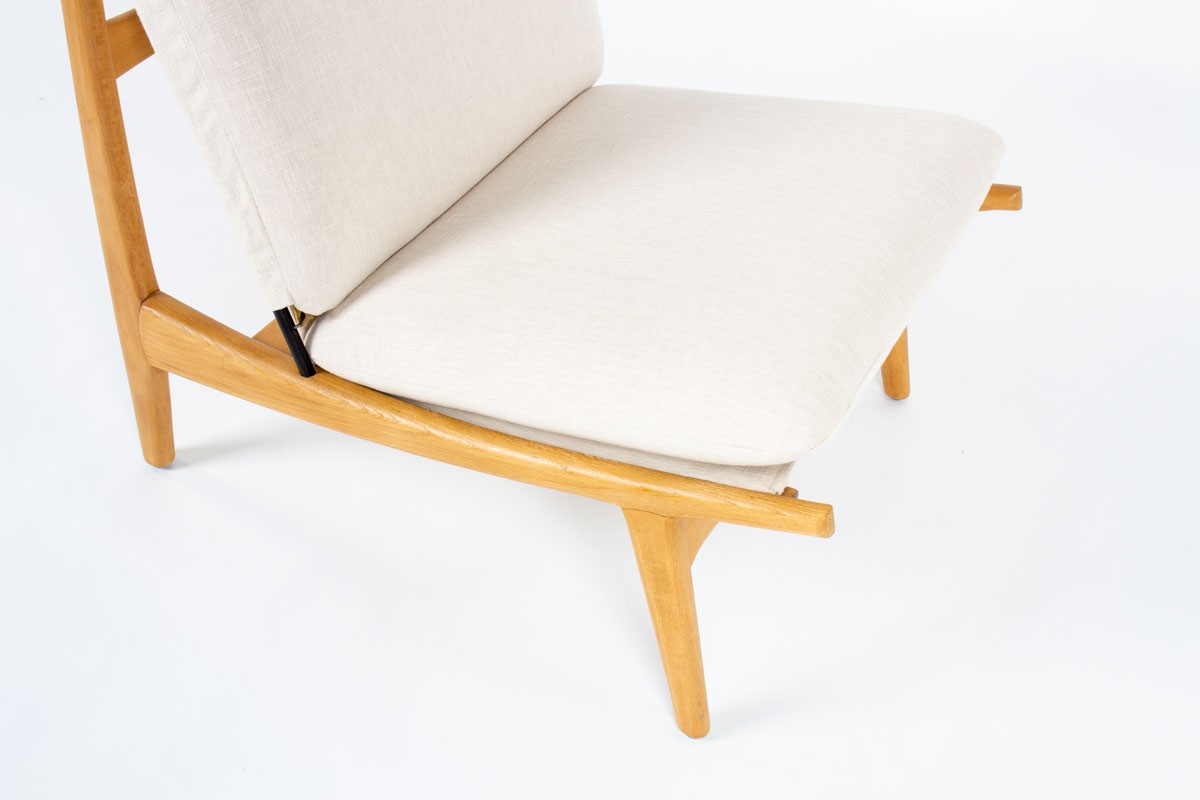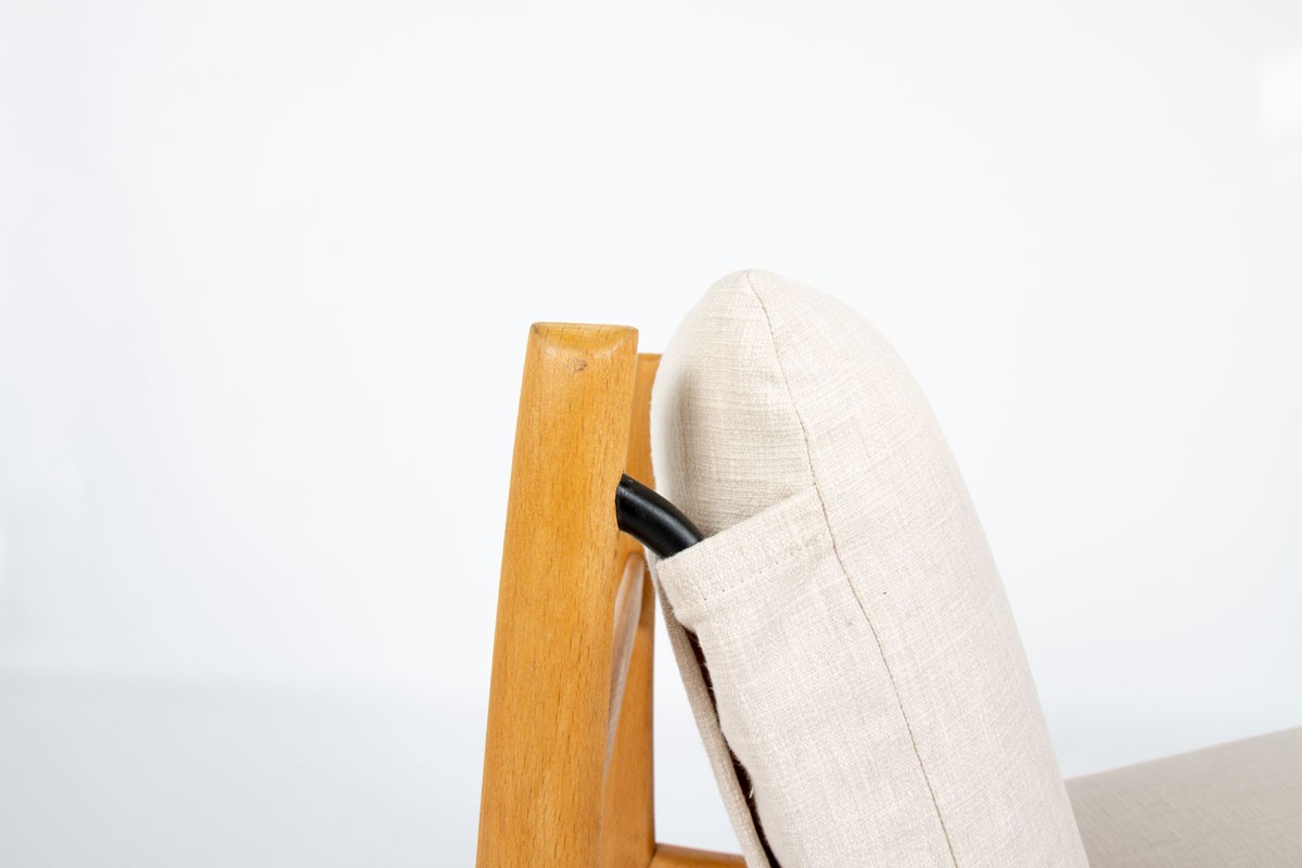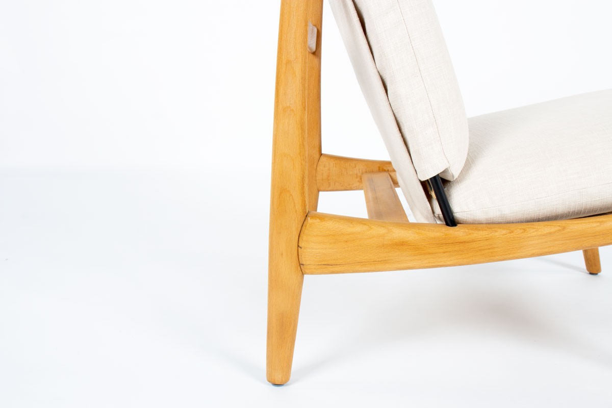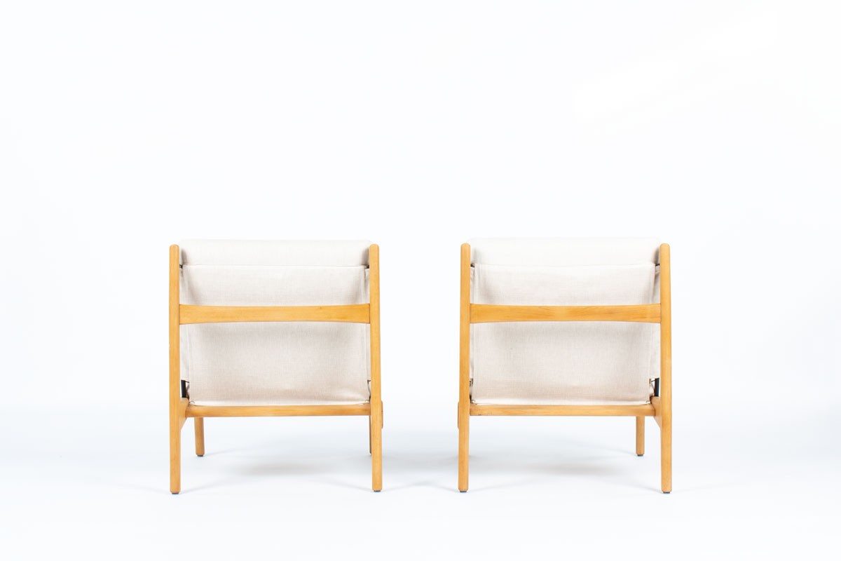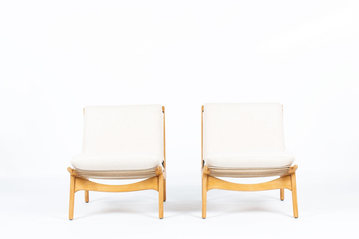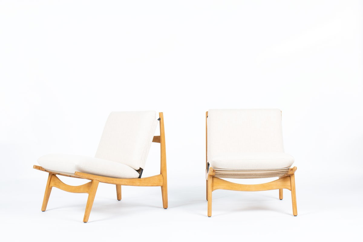 This pair of low chairs is the 790 model by the famous French designer Joseph-Andre Motte, produced by Steiner in the 1960s. It is made up of a four-legged ash structure on which foam seat and back cushions rest. These are covered with beige cotton fabric.