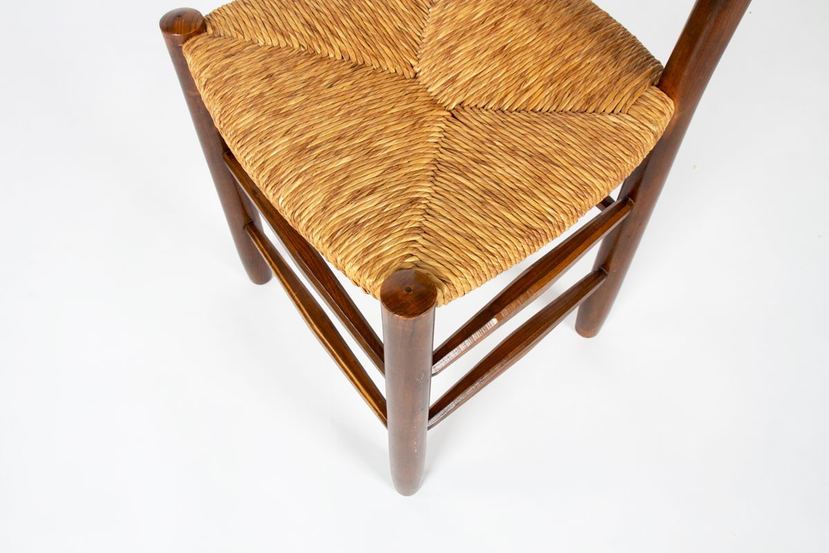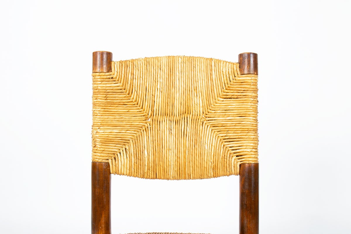 Conçu dans les années 1950, ce modèle illustre parfaitement la démarche de Charlotte Perriand, fondée sur une recherche d’épure, de fonctionnalité et de justesse dans l’usage des matériaux. Les chaises se caractérisent par une structure en frêne aux lignes sobres et équilibrées, mettant en valeur la qualité de fabrication et le soin apporté aux assemblages.