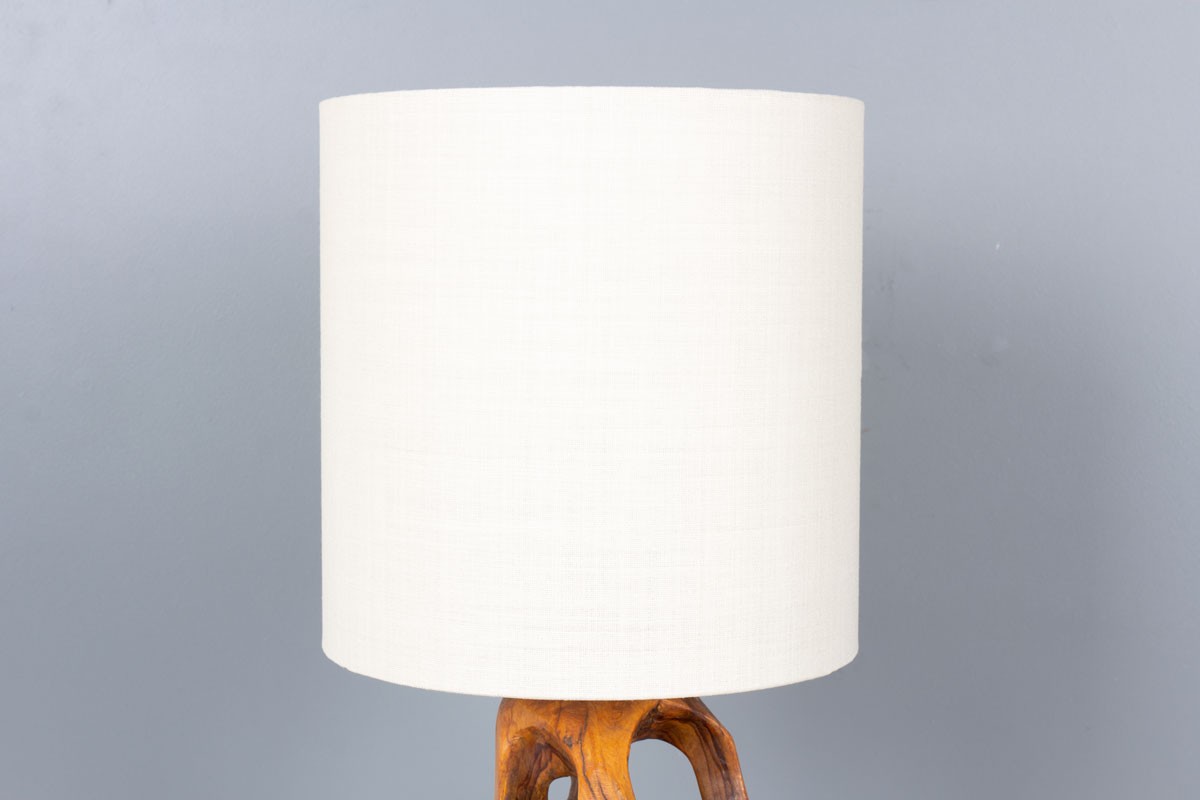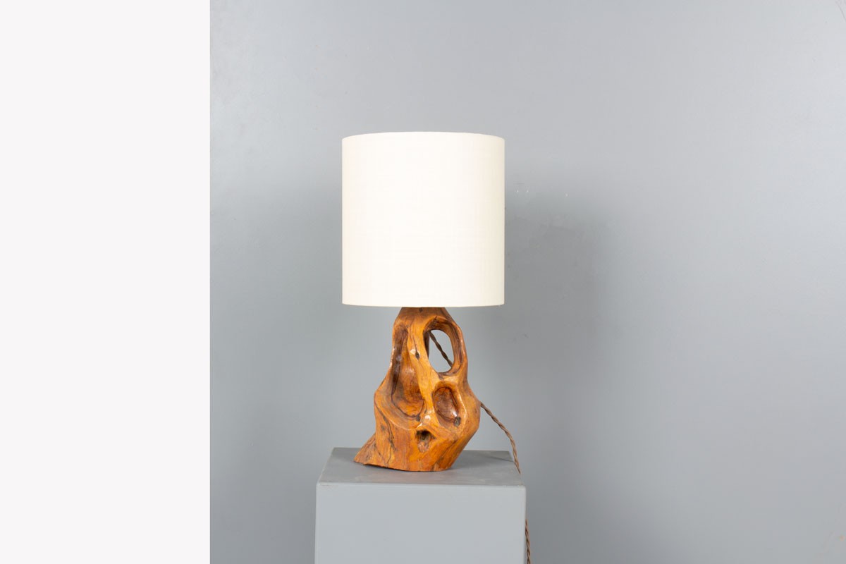 Cette lampe au design forme libre a été réalisée dans les années 50 en France. C'est une pièce unique composée d'un pied en olivier sculpté à la main et d'un abat-jour en papier.