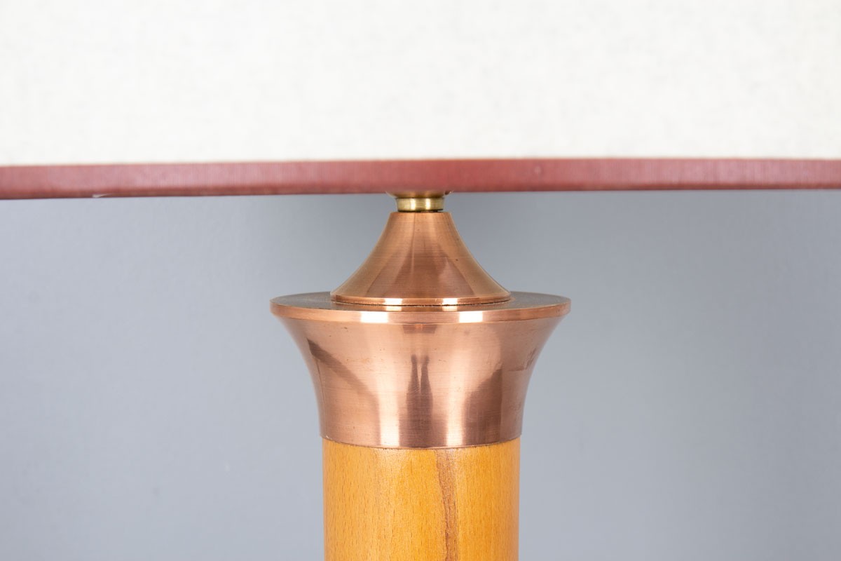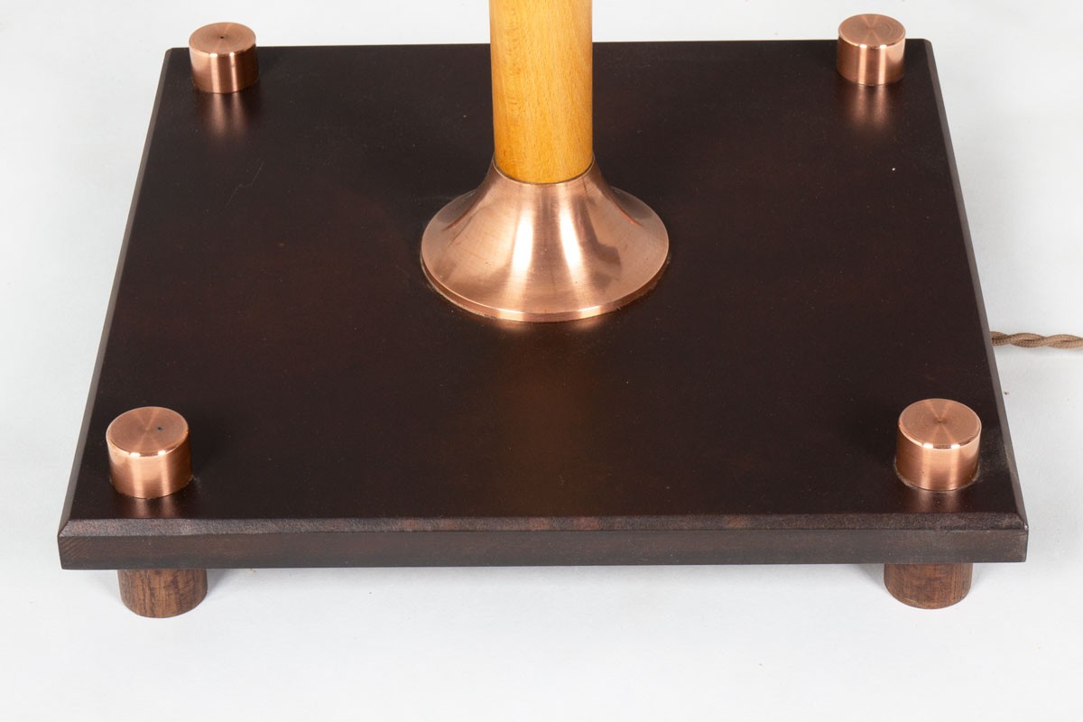 Le mélange du bois de poirier chaleureux, du cuivre lumineux et de la bakélite stylisée confère à ce lampadaire un charme unique et une présence remarquable dans n’importe quel salon, bureau ou coin lecture. L’abat-jour sur-mesure diffuse une lumière douce et agréable, parfaite pour créer une atmosphère cosy et raffinée.