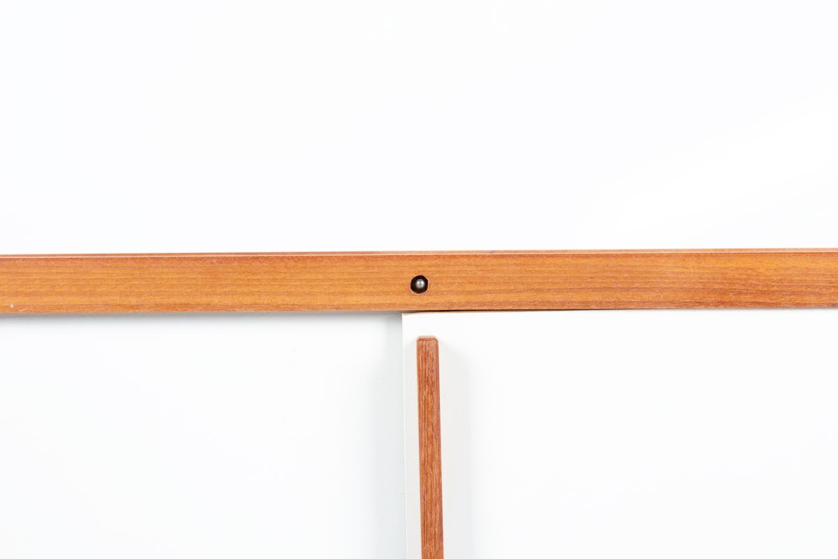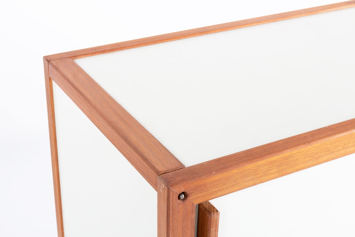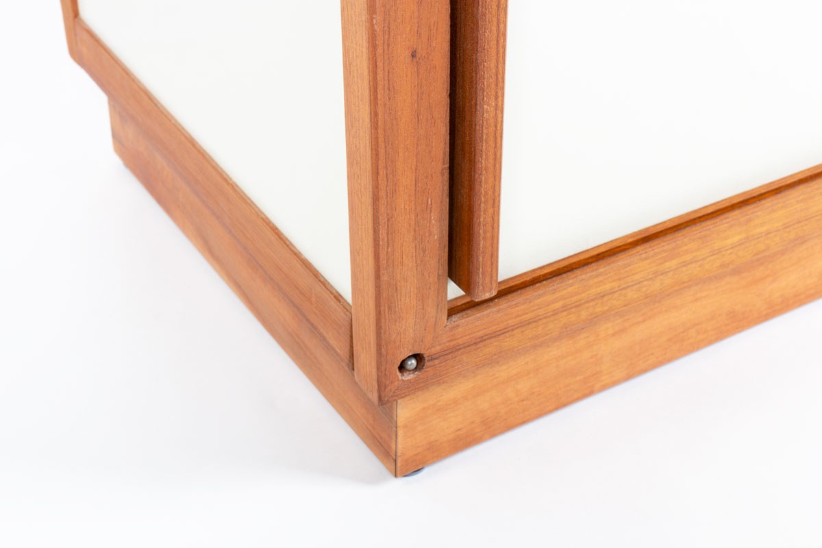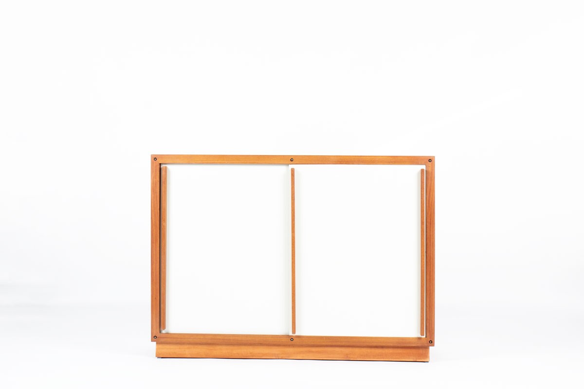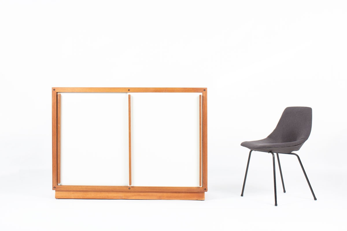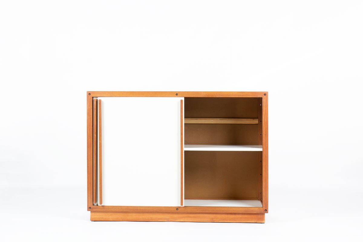 Cette enfilade a été dessinée par le célèbre ébéniste lyonnais André Sornay dans les années 60. Elle est composée d'une structure en acajou reliée par le système à tigette breveté par l'ébéniste. Les panneaux sont laqués en blanc/beige d'origine. L'enfilade est composée de deux portes coulissantes en façade ouvrant sur des étagères amovibles.
