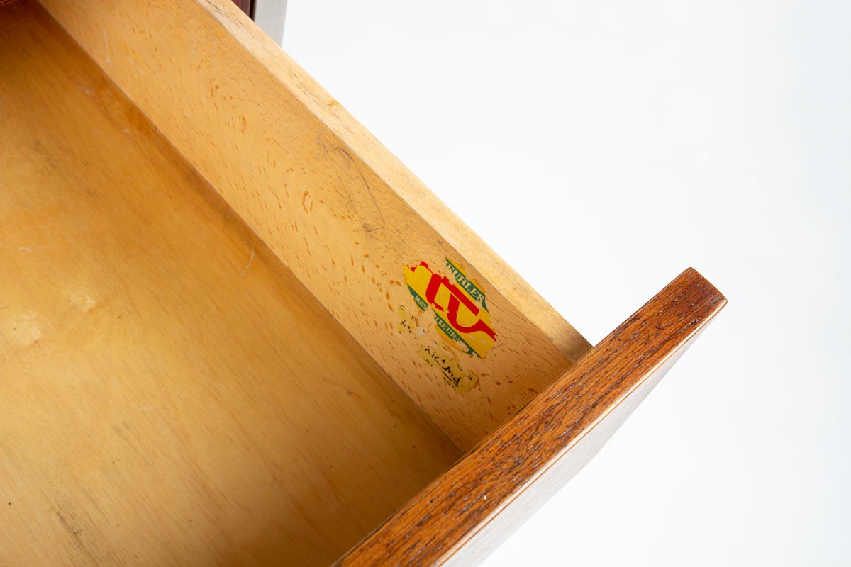 Ce bureau a été dessiné par le designer français Alain Richard et réalisé sur mesure pour un collectionneur parisien. Il a été édité par Meuble TV, comme en atteste l’étiquette d’origine présente à l’intérieur du tiroir (voir photo).